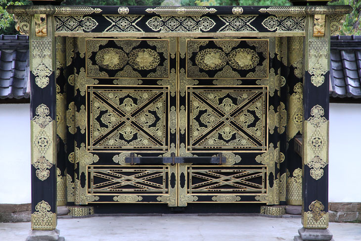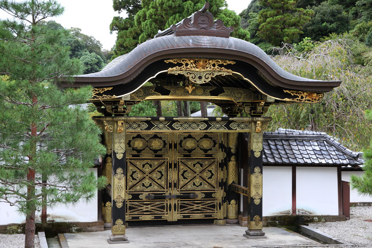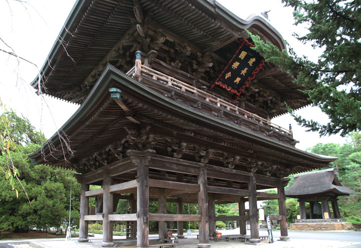 Am Ende biegt der Weg leicht ab in Richtung Nordosten, und hier steht das weitaus bessere und größere Tor (Sanmon, Tempeltor), doppelstöckig (nijumon-zukuri) mit drei allseits offenen Kompartimenten und im Obergeschoß umlaufender Galerie, das größte Tempeltor in Kamakura. Das rund 20 m hohe und auf 12 tragenden Pfosten ruhende Tor ist Edo-zeitlich und wurde 1754-1775 unter dem damaligen 201. Abt Bansetsu Sekigi errichtet, finanziert durch Spenden aus der ganzen Kanto-Region. Es ist als wichtiges nationales Kulturgut klassifiziert. Das Obergeschoß (Rojo) enthält einen Andachtsraum mit Shaka nyorai und seinen 16 Gefährten, Juu-roku Rakan, und Amida Nyorai inmitten von 500 Rakan (Arhat), Gohyaku Rakan. Sehenswert ist die faszinierende und komplexe Klammerkonstruktion (Tsume-gumi) unter den Dächern. Das Tor wird auch Tanuki-mon genannt, basierend auf der Legende, daß einst ein Tanuki sich in einen Mönch verwandelte und mit seinem Auftreten erheblich zum Spendenaufkommen beitrug. Interessanterweise hat das Tor keinerlei Torflügel und steht immer offen, kann gar nicht verschlossen werden. In einer von vielen möglichen Interpretationen deutet das auf das Prinzip des Mitgefühls im Buddhismus hin, wo niemand abgewiesen oder ausgeschlossen wird, der Hilfe und Erleuchtung sucht. Ursprünglich befanden sich an den Seiten des Tores ein Dai-zazen-dou (eine große Halle für die Sitzmeditation) und ein Dai-jiki-dou (eine große Speisehalle, das Refektorium), die sind heute verschwunden. An einen der tragenden Pfosten gelkehnt findet man eine Sitzstatue von Binzuru. Pindola war einer der 16 Arhats, also der ersten Gefolgsleute des Buddha Shakyamuni, aber er soll sich mit Zauberei befaßt haben und seine starken psychischen Kräfte mißbraucht haben, deshalb darf er nicht in die Gebäude hinein zu den anderen Gefährten. Im einfachen Volksglauben dient er als "Heiler" (Binzuru), man reibt ihn für Gesundung an der dem eigenen Leiden entsprechenden Stelle.