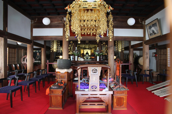 In der 1650 erbauten Haupthalle (Hondo, Hondou) gibt es insgesamt 10 hölzerne Statuen, darunter die der Protagonisten dieser Gründungsgeschichte, von Nichiren Shounin (1661 hergestellt, in der Mitte), von Nichirou (1673), von Mitsunori sowie von Shijou Kingo und seinen drei Söhnen (alle 1673). Dazu gibt es noch eine 1844 angefertigte Statue der Nonne Obai-in. Als hauptsächliche Objekte der Verehrung dienen die Nichiren-Statue und eine hölzerne Odaimoku-Tafel, auf der die Worte der Formel Namu-myou-hou-renge-kyo (das zentrale Mantra und die grundlegende Praxis im Nichiren-Buddhismus) von Nichiren selbst geschrieben worden sind. Die Haupthalle ist meistens geschlossen, mit Glück ist ein Fensterchen geöffnet zum Hineinschauen, und mit viel Glück kann man nach einem Gottesdienst hinein in die Halle. Die Kalligraphie-Tafel über dem Eingang der Haupthalle trägt den Wortlaut "shikou dai-ichi", von rechts nach links geschrieben mit dem langen Strich für die "1" am linken Ende, das bedeutet soviel wie "der Lehrmeister zuerst", also daß ein Schüler stets loyal zu seinem Lehrer sein soll.