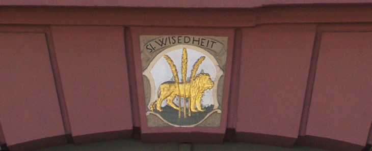 Das Familienwappen der Grafen von Schönborn besitzt 9 heraldische Inhalte. Im Gegensatz zum Wappen an der Pfarrkirche St. Mauritius sehen wir hier eine andere Anordnung und Felderaufteilung, nämlich mit zwei Bögen schräggeviert und dann weiter unterteilt: