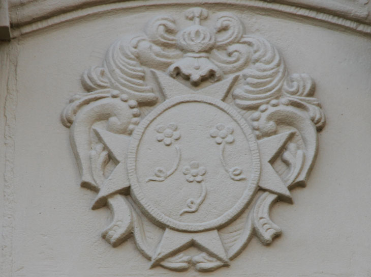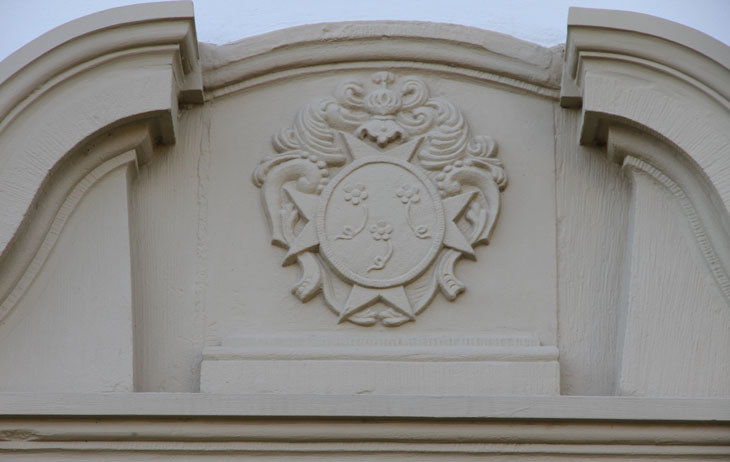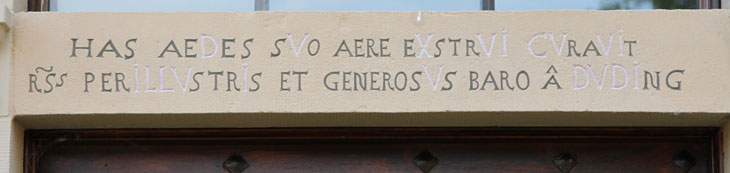 Die Inschrift auf dem Portalsturz zwischen Tür und Oberlicht lautet: "HAS AEDES SVO AERE EXSTRVI CVRAVIT / R(EVERENDIS)S(IMV)S PERILLVSTRIS ET GENEROSVS BARO A DVDING" - dieses Gebäude ließ der ehrwürdigste, berühmte und großzügige Freiherr von Duding mit seinem eigenen Geld errichten. Gleichzeitig birgt die Inschrift eine Datierung des Bauwerks durch ein Chronogramm: D + V + X + V + I + C + V + V + I + I + L + L + V + I + V + D + V + D + I = 500 + 5 + 10 + 5 +1 + 100 + 5 + 5 + 1 + 1 + 50 + 50 + 5 + 1 + 5 + 500 + 5 + 500 + 1 = 1750. Das "Reverendissimus" mußte abgekürzt werden, weil sonst das Zahlziel um 1512 verfehlt worden wäre. Die originale hölzerne Tür ziert ein großes, erhaben eingeschnitztes Malteserkreuz.