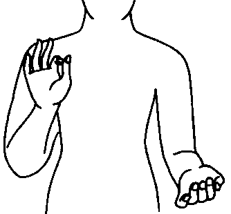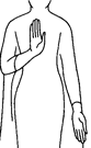 Brust, Handfläche nach außen. Die linke Hand bedeckt