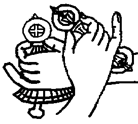 Körper hin, jede Hand hält einen Gegenstand, nämlich