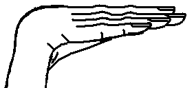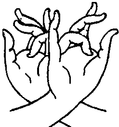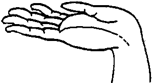 waagerecht abgeknickt, alle Finger horizontal, leicht zur