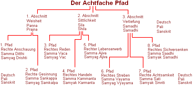 Der edle achtfache Pfad ist im Grunde eine detaillierte Ausarbeitung der vierten Wahrheit und gibt acht Richtlinien für menschliches Denken und Handeln, die Kernbestand der buddhistischen Lehre sind. Zum Erlöschen des Leidens führt der "Edle Achtfache Pfad" (Ariya Atthangika Magga in Sanskrit, Ariya Atthangika Marga in Pali). Wer ihn beschreitet, wird früher oder später durch die Befolgung desselben erleuchtet. Im einzelnen umfaßt er: