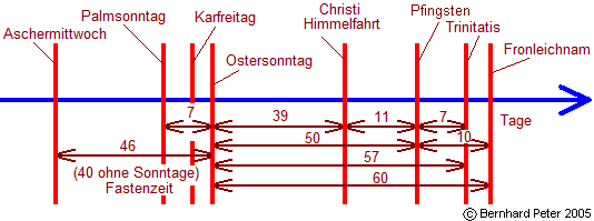 Abb.: Die in Bezug auf den Gregorianischen Kalender beweglichen Feiertage des Osterzyklusses.