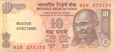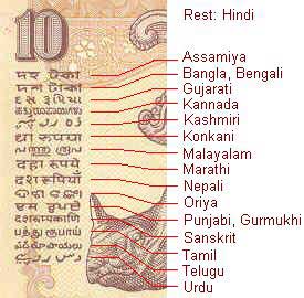 Die indischen Banknoten tragen dem Vielsprachen- und Vielschriftenstaat Indien Rechnung. Als Beispiel diene eine einfache 10-Rupien-Banknote, mitgebracht im Jahre 2005.