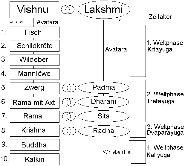 Vishnu soll den Dharma hüten, die göttliche Weltordnung. Diese Aufgabe kann er nur erfüllen, indem er rettend eingreift, wenn die Welt mal wieder aus dem Gleichgewicht gerät. Dazu verkörpert er sich und steigt als Avatara auf die Erde herab, um Retter der Welt helfend einzugreifen und das Gleichgewicht wieder herzustellen. In diesem Sinne wurden auch bestimmte herausragende religiöse Gestalten zu seinen Avataren erklärt. Es gibt insgesamt 10 bekanntere Avatare, jeder von ihnen kämpfte auf seine Weise für die Wiederherstellung des Weltengleichgewichtes, nachdem es gestört war. Und damit sie ihrem Gatten auch dann nahe sein kann, steigt manchmal auch seine Gattin Lakshmi herab und verkörpert sich in der Gefährtin des jeweiligen Avataras.