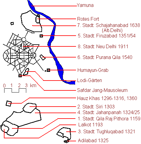 Alle anderen Gründungen liegen östlich am Fluß Yamuna und südlich von Neu-Delhi, der achten Stadtgründung als Metropole des "Empire of the East". Das Interesse der britischen Besatzung galt zuerst den wichtigen Handels- und Hafenstädten. Das änderte sich mit dem Sepoy-Aufstand. Danach wurde die Macht der Moghuln vernichtet. Der letzte Mogulherrscher mußte nach Birma ins Exil gehen. Mit seinem Tod 1862 endete die Linie der Mogulherrscher, die Nordindien und insbesondere Delhi während mehrerer Jahrhunderte geprägt hatte. Die Macht in Delhi übernahmen die Briten. Sie machten es symbolisch zur neuen Hauptstadt eines Kolonialreiches, das nun ohne jeden Rest eines Anscheins von Selbständigkeit unter ihrer direkten Kontrolle und Verwaltung stand und der Willkürherrschaft über 70 Jahre lang hilflos ausgeliefert war. Die Grundsteinlegung für die neue Hauptstadt Neu-Delhi erfolgte im Jahre 1911. Neu Delhi mit seinen breiten, hexagonal angeordneten Strassen, großräumig-symmetrischen Planungen und den monumentalen Regierungsbauten hat symbolträchtigen Charakter und wurde bewußt als Kontrapunkt zum alten Delhi angelegt.
