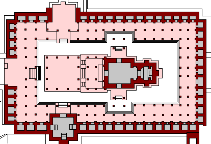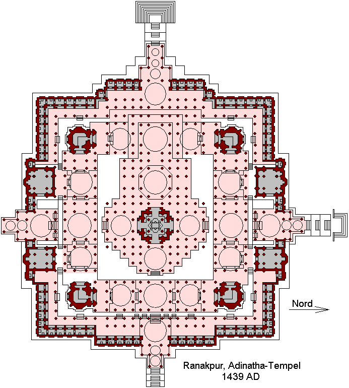 Abbildung: Tempel, 1439 erbaut, auch Adinatha geweiht, Mount Abu, Rajasthan (sinnvoll ergänzte Rekonstruktion, weil unvollendet. Der ganze obere und rechte Teil fehlt).