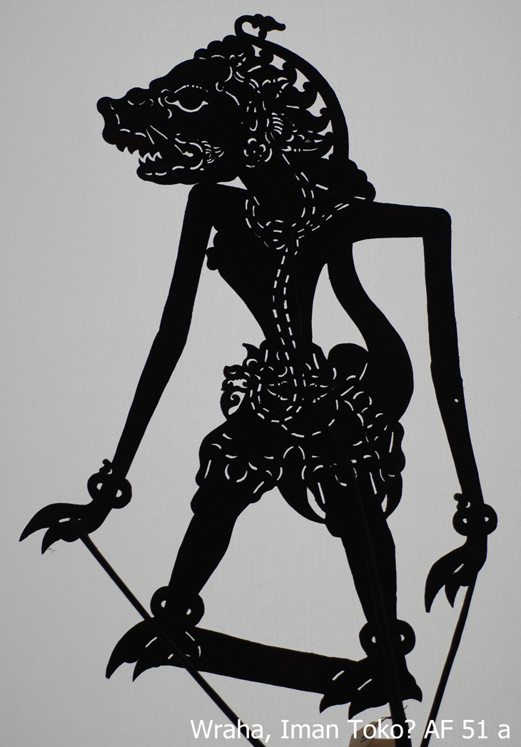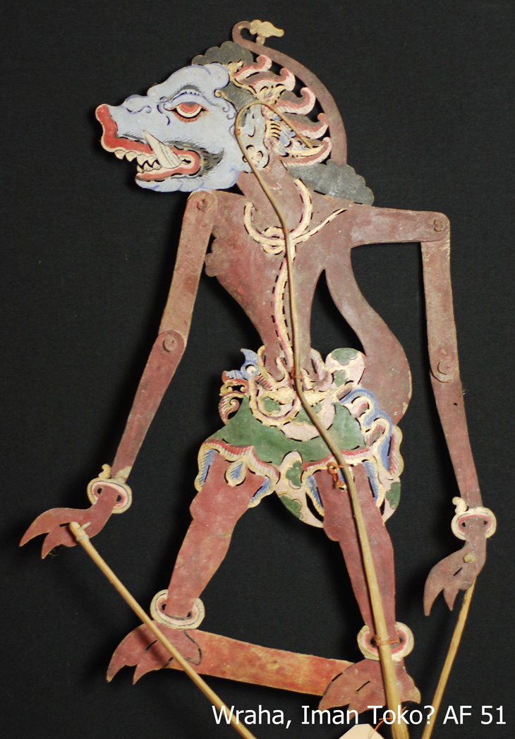 Kapi Wraha hat den Körper und den Schwanz eines Affen, aber den Kopf eines Ebers oder eines Wildschweins. Alle vier Extremitäten haben gespaltene Hufe. Der Name "Wraha" leitet sich von Skrt. Viraha ab, das den Eber bezeichnet. Wisnu hat als einen seiner Avatara den Eber Viraha. Kapi Wraha diente unter König Ramawijaya´und gehörte auch der Pancawati-Armee an. Ein alternativer Name der Figur ist Kapi Celeng. Es handelt sich um einen Affenkrieger von zwar exzentrischer Natur, aber von starken Überzeugungen im Kampf gegen die böse Seite..