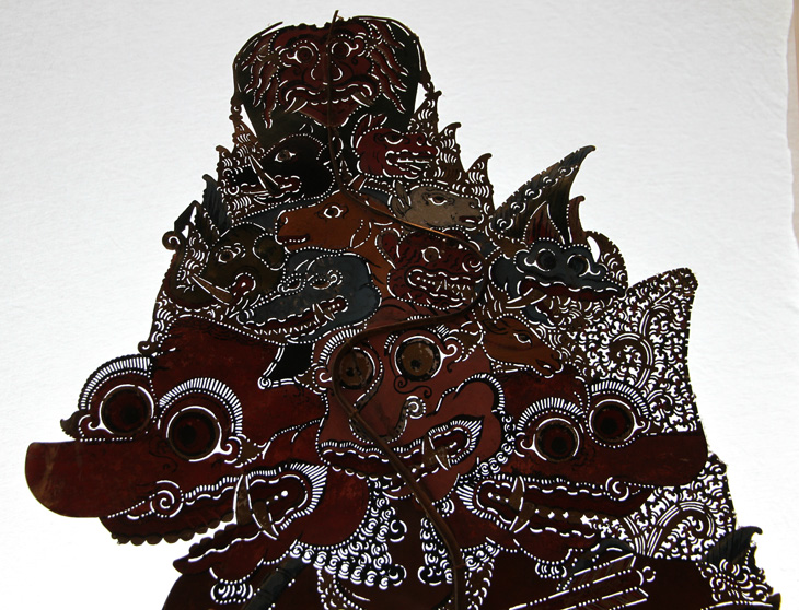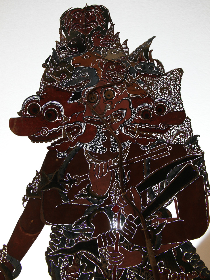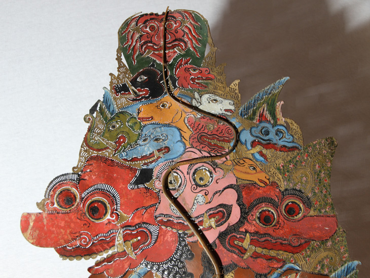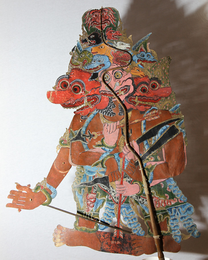 Vorschlag DS: Rahwan in der Brahala-Form. Identifizierung dieser Figur durch Freek Bracke und Dalang Langen Bradanaya als Buta Sewu. Buta Sewu oder Brahala Sewu ist ein furchterregender Riese. Es handelt sich um eine zornige Inkarnation von Kresna, während seines Triwikrama. Brahala Sewu ist ein tausendgesichtiger Riese, der die Wolken überragt. Man glaubt, dass Krishna selbst in seiner Brahalasewu-Gestalt seine Emotionen noch beherrschen kann. Kresna nahm einmal eine solche Form an, und dabei kamen Soldaten und einige Kauravas, die sich aus eigenem Verschulden gegen Brahala Sewu stellten, zu Tode. Dennoch schützte Kresna, der mit seiner Macht ein ganzes Land hätte zerstören können, die Bevölkerung. Es ist noch ungeklärt, ob diese Figur wirklich Buta Sewu ist. Andere Theorien sind eine Brahala-Form von Dasamuka/ Rahwana oder eine Form von Kumbakarna. Weitere Hinweise willkommen.