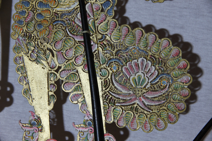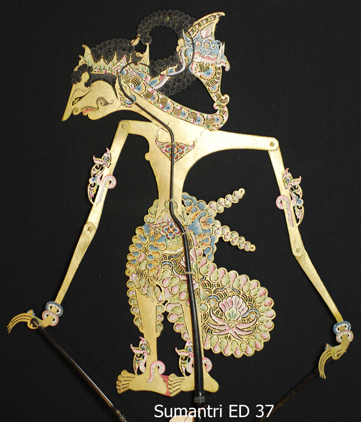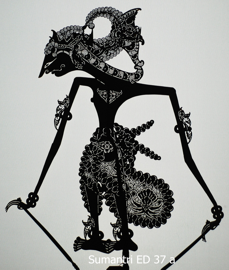 Vorschlag DS: Sumantri. Das ergäbe nach dem Schematismus von Franke-Benn den Typus 1-1-40.502.6.7. Mit dieser Nummer gibt es Raden Samba, aber mit erhobenem Blick. Die vorliegende Form fehlt in der Liste von Franke-Benn. Bei ihr ist Sumantri weitab mit 1-3-40.60.7, also mit dem aus vielen herabhängenden Teilen bestehenden Hüfttuch und mit dem abstehenden Schmuck hinter dem Ohr, ohne Garuda und ohne Diadem. Bei Moog entspricht die Zeichnung dem Schema 1-3-40.501.6.701, also wieder anders. Die oben abgebildete Figur wurde von Dalang Langen Bradanaya hingegen als "Docang" identifiziert - es gibt keine Figur mit diesem Namen, nur etwas zu essen.