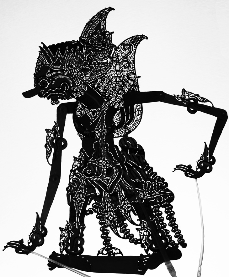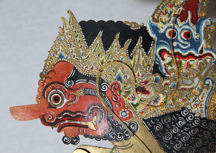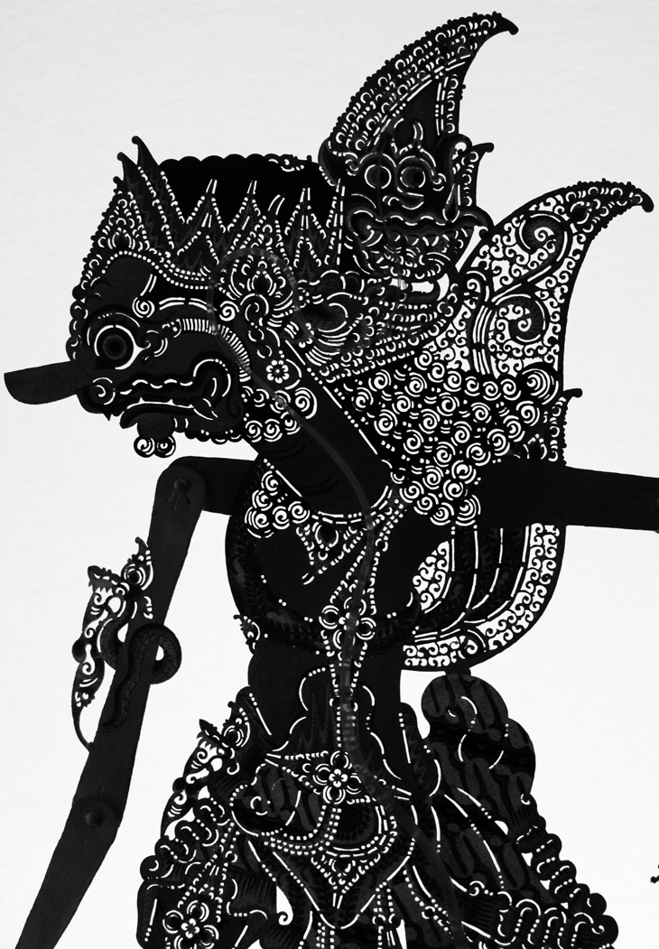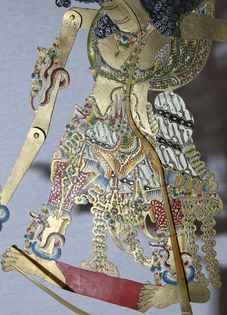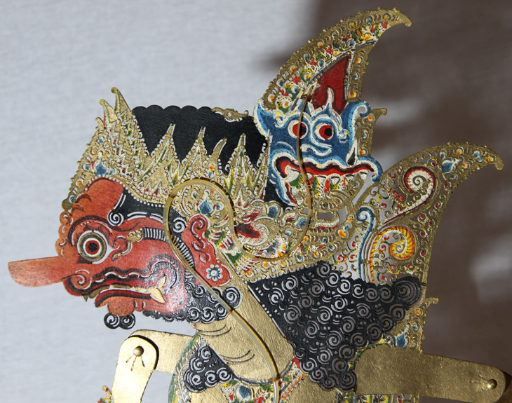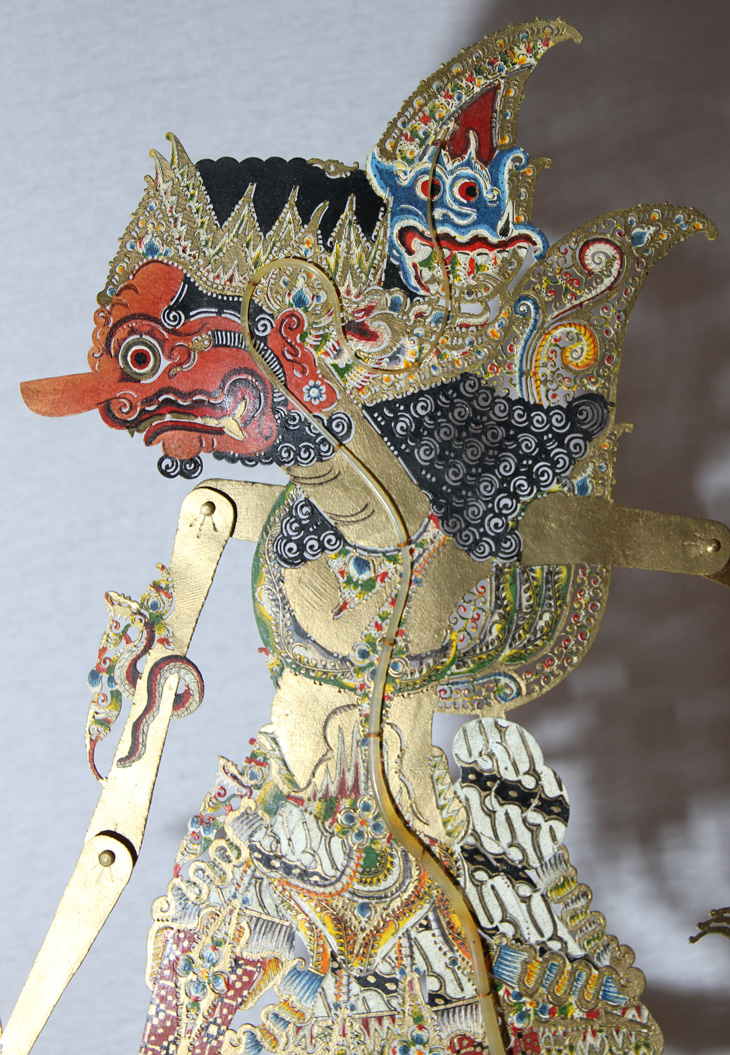 Die abgebildete Figur hat nach dem Franke-Benn-Schematismus den Typ 3-3-1.43.503.60.70. Rote Gesichtsfarbe, Blick leicht gesenkt. Nach dem Franke-Benn-Schematismus kommen dafür drei Charaktere in Frage, 1.) Prabu Rahwana Raja, mit gesenktem Blick, 2.) Prabu Gardapati, mit geradem Blick, und 3.) Raden Dewatumut, mit leicht gesenktem Blick. Die meisten Darstellungen von Rahwana zeigen ihn mit Mahkota, aber es gibt auch solche ohne, die dieser Figur entsprechen. Die meisten Darstellungen von Gardapati zeigen ihn ohne Mahkota, es gibt Varianten ohne offenes Haar und mit erhobenem Blick. Beide Figuren haben die sichtbaren Fangzähne. Über die dritte Option, Dewatumut, ist nichts herauszubekommen. Die hier gezeigte Figur hat einen deutlich gesenkten Blick. Der nächste Vorschlag lautete Duryodana. Eine weitere Identifizierung erfolgte durch Dalang Langen Bradanaya als "Brajadenta". Franke-Benn gibt für Brajadenta an: 30-3-423.502.6.70, was in mehreren Kriterien von der vorliegenden Figur abweicht. Vorschlag DS: Duryodana, Suyudana. Wegen der vielen Vorschläge, von denen sich keiner anhand des Vergleichsmaterials durchsetzen kann, bliebt die Figur weiterhin offen.