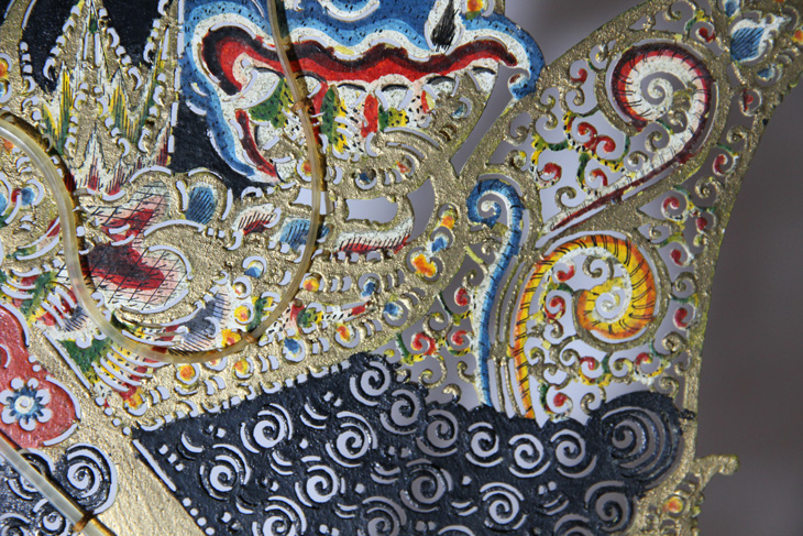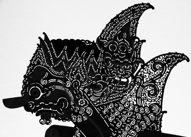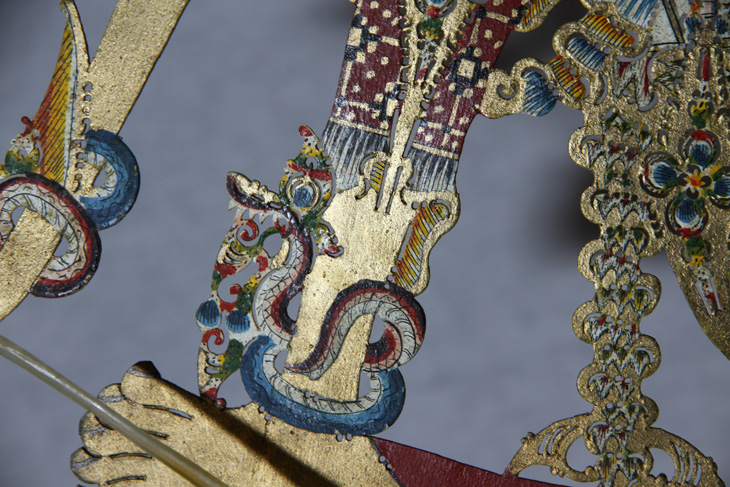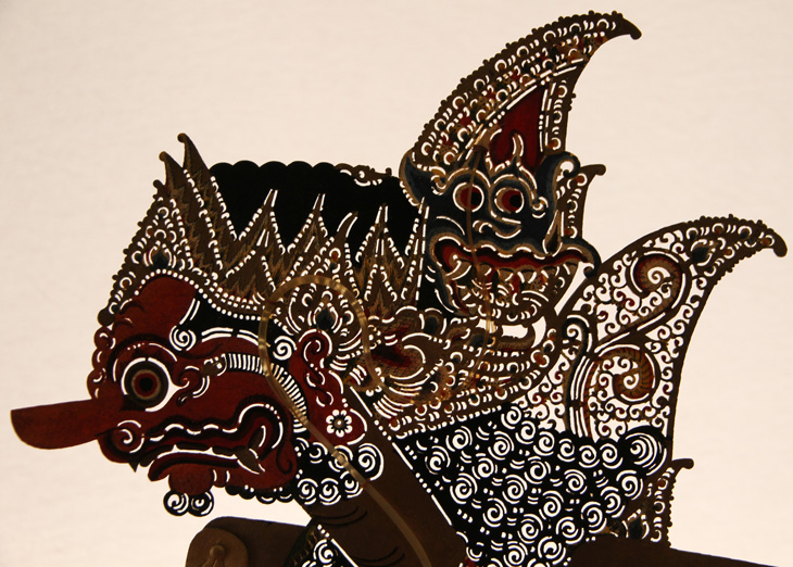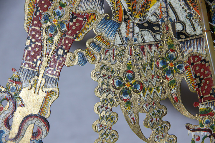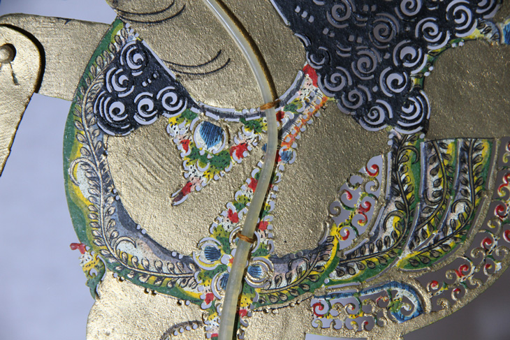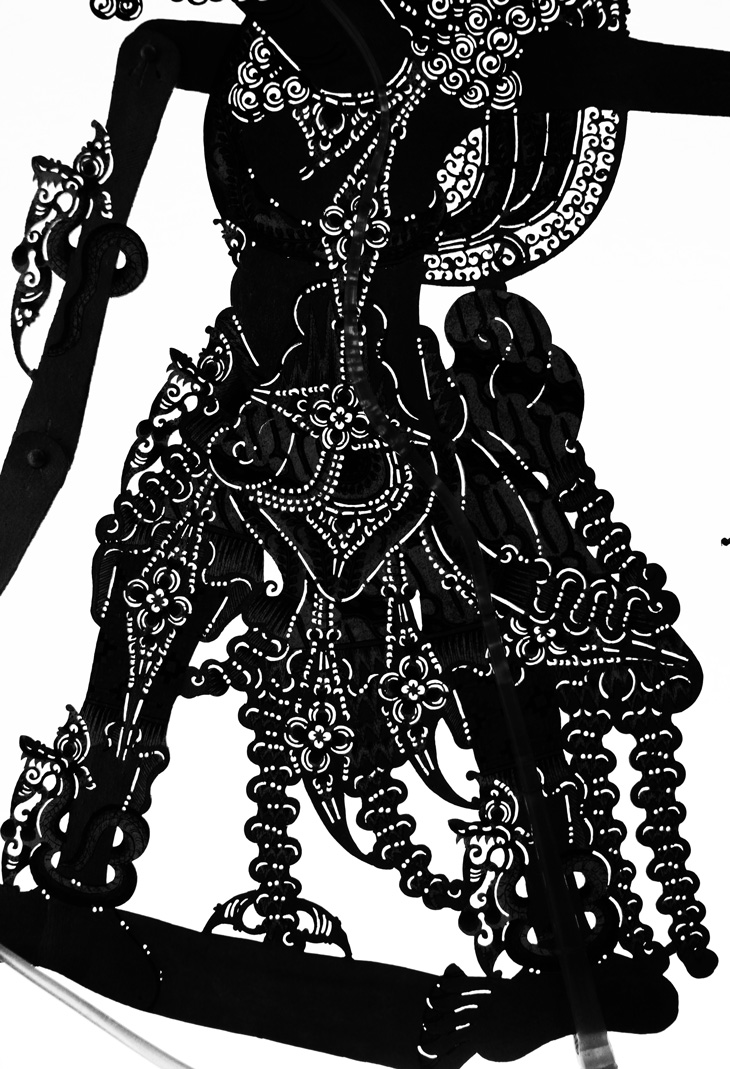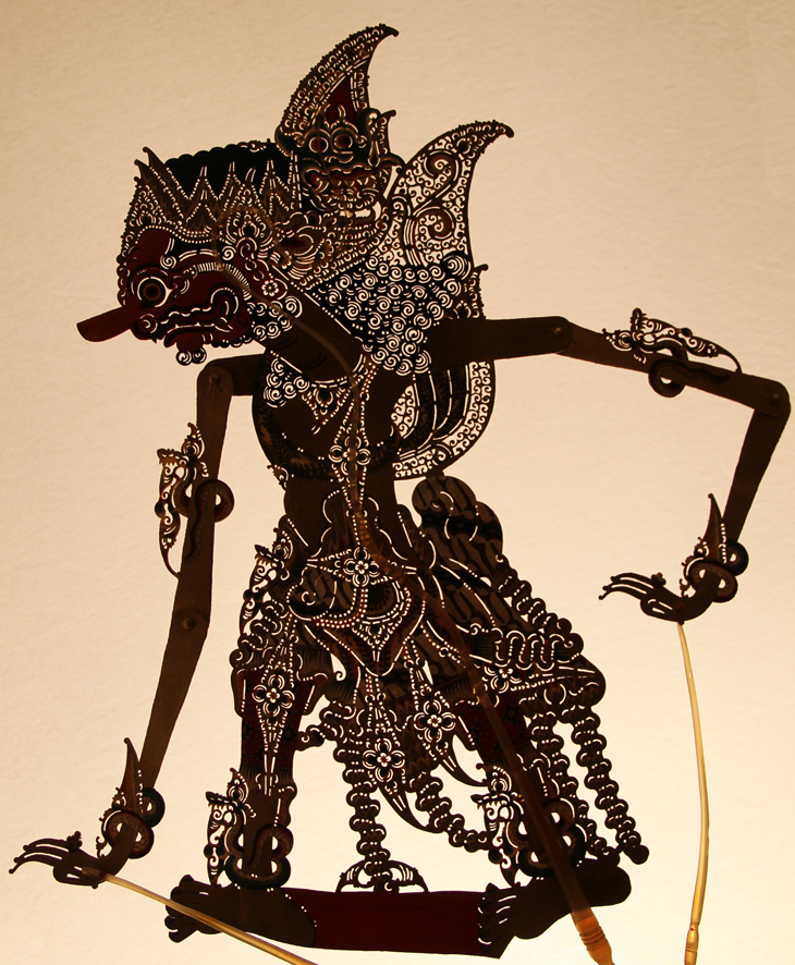 Die abgebildete Figur hat nach dem Franke-Benn-Schematismus den Typ 3-3-1.43.503.60.70. Rote Gesichtsfarbe, Blick leicht gesenkt. Nach dem Franke-Benn-Schematismus kommen dafür drei Charaktere in Frage, 1.) Prabu Rahwana Raja, mit gesenktem Blick, 2.) Prabu Gardapati, mit geradem Blick, und 3.) Raden Dewatumut, mit leicht gesenktem Blick. Die meisten Darstellungen von Rahwana zeigen ihn mit Mahkota, aber es gibt auch solche ohne, die dieser Figur entsprechen. Die meisten Darstellungen von Gardapati zeigen ihn ohne Mahkota, es gibt Varianten ohne offenes Haar und mit erhobenem Blick. Beide Figuren haben die sichtbaren Fangzähne. Über die dritte Option, Dewatumut, ist nichts herauszubekommen. Die hier gezeigte Figur hat einen deutlich gesenkten Blick. Der nächste Vorschlag lautete Duryodana. Eine weitere Identifizierung erfolgte durch Dalang Langen Bradanaya als "Brajadenta". Franke-Benn gibt für Brajadenta an: 30-3-423.502.6.70, was in mehreren Kriterien von der vorliegenden Figur abweicht. Vorschlag DS: Duryodana, Suyudana. Wegen der vielen Vorschläge, von denen sich keiner anhand des Vergleichsmaterials durchsetzen kann, bliebt die Figur weiterhin offen.