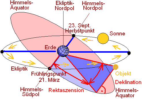 Genau wie man einen beliebigen Punkt auf der Erde durch Angabe seiner Koordinaten, der geographischen Länge und Breite, charakterisieren kann, so kann man einen beliebigen Punkt des Himmels durch Koordinaten definieren. Dafür gibt es drei verschiedene Methoden. Allen gemeinsam ist, daß wir irgendeinen Bezugspunkt benötigen, so daß wir die relative Lage eines Himmelskörpers zu diesem Bezugspunkt angeben können. Besonders geeignet hierzu ist der Frühlingspunkt, der ganz einfach selbst mit primitivsten Mitteln zu bestimmen ist: