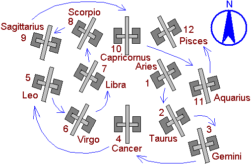 | 1 | Aries | 21.3.-20.4. | West 90 - 300 Ost | ca. 26 Grad |