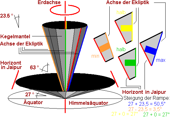Die Rampen sind so gebaut, daß zu bestimmten Beobachtungszeiten genau eine Rampe parallel zur Achse der Ekliptik ist, d. h. die Rampe ist in dem Moment auf den Pol der Ekliptik ausgerichtet. Da die Achse der Ekliptik um die Erdachse rotiert, verändert sich im Laufe eines Tages/Monats/Jahres ihre Lage ständig in Relation zur Erdachse und damit zur Beobachtungsebene, zur Bezugsebene, zur ebenen Plattform in Jaipur, auf der die Instrumente stehen. Die Lage der Ekliptikachse schwankt also theoretisch von 27°+ 23.5° = 50.5° bis 27° - 23.5° = 3.5°. Entsprechend weit gefächert ist auch die Neigung der Rampen. Es liefert immer nur ein Instrument von den 12 ein korrektes Ergebnis, sechsmal jeweils ein anderes am Tage, sechsmal eines der verbliebenen in der Nacht, weil nur eines die gerade richtige Rampenneigung hat. Dieses eine zeigt dann auf seinen Quadrantenflügeln ekliptikale Zeit bzw. ekliptikale Koordinaten an. Gemeinsam können alle 12 Instrumente die ekliptikalen Koordinaten eines ganzen siderischen Jahres abdecken und jeweils die richtige siderische Zeit angeben.