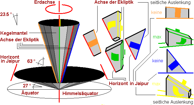 Nehmen wir noch einmal den oben beschiebenen Rotationskegel der Ekliptikachse um die Erdachse als Bezugspunkt, so, wie wir es auf der Erde wahrnehmen: Maximale Auslenkung nach hinten (von der Sonne weg) entspricht maximaler Ekliptik und minimaler Steigung für die Sommerinstrumente. Maximale Auslenkung nach vorne (zur Sonne hin) entspricht minimaler Ekliptik und maximaler Steigung für die Winterinstrumente. Wenn die Sonne genau über dem Äquator und damit im Himmelsäquator steht, ist die Steigung des Instrumentes gleich der geographischen Breite. Folgende Graphik illustriert die Geometrie von vier ausgewählten Instrumenten, die Sonne stehe in der Abbildung rechts: