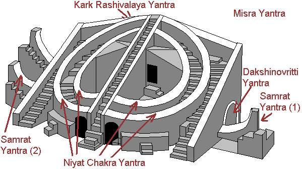 Kark Rashivalaya Yantra: An der Nordseite (Rückseite) der Rampe ist eine halbkreisförmige 180°-Skala angebracht. Die Rückwand ist nicht genau senkrecht, sondern so geneigt, daß sie genau dann parallel zur Achse der Ekliptik steht, wenn die Sonne ins Sternbild des Krebses eintritt, also ihren höchsten Punkt erreicht. Wenn also der Zeiger dieses Instrumentes vom Sonnenlicht erreicht wird, ist die Sonne in das Sternbild des Krebses eingetreten, und die Koordinaten der Sonne können an der Skala abgelesen werden. Die restliche Zeit bleibt die Skala im Dunkeln.