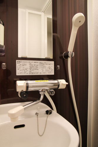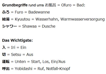 Grundsätzlich gilt die japanische Sitte, daß die Badewanne (Furo) zum Genießen und Entspannen da ist, nicht zum Abwaschen von Dreck und Schweiß, für letzteres gibt es die Dusche (Shawaa) oder einen Wasserhahn (Kyuutou) und einen Eimer und einen Schemel. Eine Dusche nehmen = shawaa o abimasu, ins Bad steigen = ofuro ni hairimasu. Also seift man sich vorher außerhalb der Wanne ein und duscht sich ab (keine Seife ins Badewasser!). Dann geht man sauber in die Badewanne (Furo). Im Hotel oder in der Ferienwohnung ist das völlig egal, aber in Privatwohnungen und Privatunterkünften wird das gleiche Wasser für mehrere Personen zum Baden benutzt. Deshalb geht man sauber rein und läßt das Wasser nach dem Baden auch nicht ab: Stop dem Reflex, Stöpsel NICHT ziehen!
