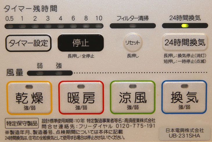 Über den vier Haupttasten gibt es vier weitere Tasten. Ganz links, weiß und schwarz umrandet: Zeit festlegen für den Timer "Timer-Einstellung", Timer = in Katakana "taimaa". Mitte links, schwarz: Timer ein/aus "Stoppen", darunter: "lang drücken: alles stoppen". Darunter von links nach rechts: "Luftstrom", ""schwach", "stark". Ganz oben links am Rand steht "Timer Restzeit". Ganz rechts, weiß: 24 h off für den Ventilator "24 Stunden Belüftung", "lang drücken: "Lüftungsstopp (aus)", "kurz drücken: Pause (blinkend)". An der kleinen runden Taste mittig rechts steht in Katakana: firetaa - "Filter und Reinigung", "zurücksetzen: lange drücken", anscheinend eine Kontrolleuchte bei zugesetztem Luftfilter - das braucht uns als Hotelgast nicht zu kümmern.