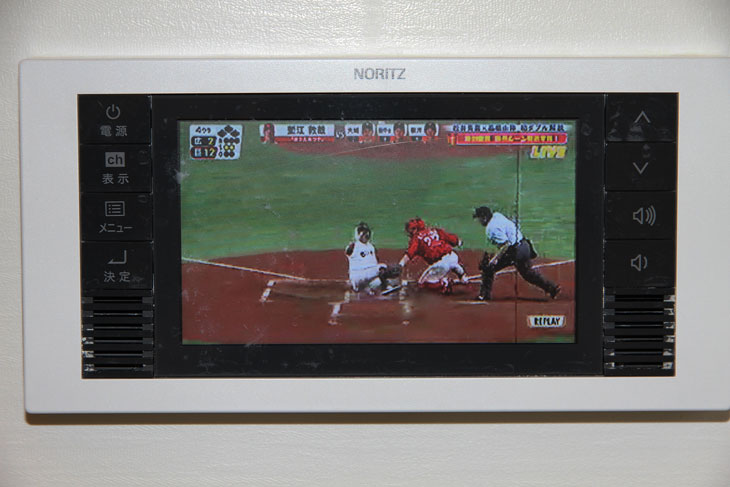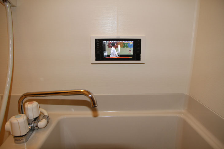 Im Land der Technik-Verliebtheit ist es Standard, daß man in der Badewanne fernsehen kann: Hier ist an der Stirnseite ein kleiner TV-Monitor angebracht. Wenn wir wie gewohnt duschen wollen, sollten wir noch einmal daran denken: Diesen Bildschirm besser nicht unter Wasser setzen! Man kann und darf auch vor der Wanne duschen. Und wer in der Wanne duschen will, stülpt am besten eine Plastiktüte über den Monitor oder paßt auf, daß der nicht geflutet wird.