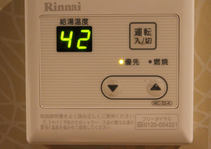 So ein Kontrollfeld dient der Heißwasserbereitung. Links oben die "42" zeigt die eingestellte Wassertemperatur an, darüber steht "Warmwassertemperatur". Rechts oben steht "Betrieb ein/aus". Die Pfeiltasten regeln die Temperatur nach oben und unten. Wo die Kontrollleuchte brennt, steht "Priorität". Unten in hellgrau steht noch der gutgemeinte Hinweis, daß man sich die Bedienungsanleitung bitte vor Gebrauch sorgfältig durchlesen möge. Für mögliche Fragen wird rechts unten eine kostenlose Hotline angeboten: "furiidaiyaru" ist ein Anglizismus und bedeutet "free dial".