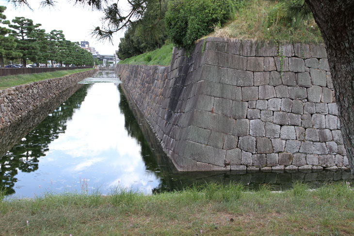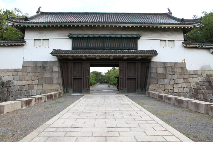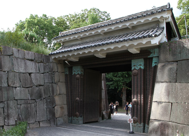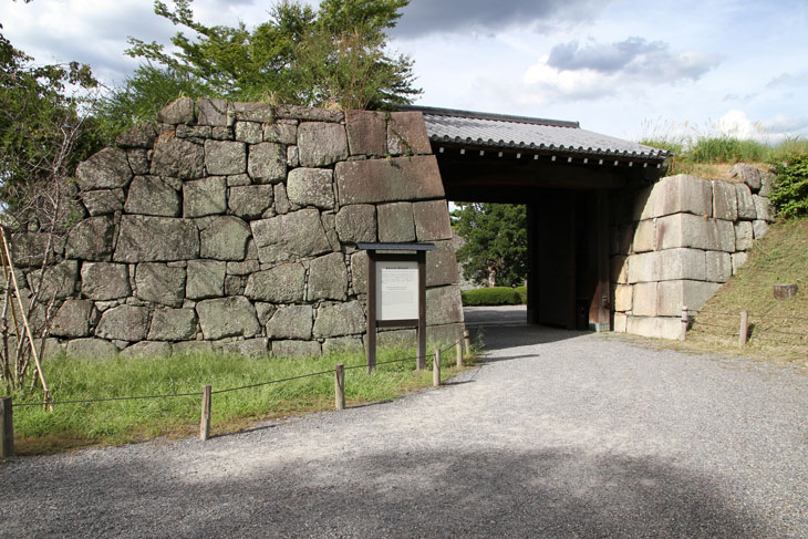 Beim Westtor sieht man einen gemauerten Ansatz von quadratischem Zuschnitt von der äußeren Wassergrabenmauer einspringend; das letzte Stück war aus Holz und entfernbar. Hinter dem Tor lag innen ein auf drei Seiten von Wällen umgebener Zwinger im Masugata-Stil, in dem der Ankommende sich 90° nach Norden wenden mußte, um weiter in die Anlage vordringen zu können. Die Wälle sind hier reihum mit heute noch erhaltenem Ishigaki versehen, so daß der Ankommende sich in einem Kessel aus Steinwänden wiederfand, aus dem es nur einen etwas verengten Durchlaß nach Norden gab. Das aus der frühen Edo-Zeit stammende Westtor wurde auch Uzumi-mon genannt, wörtlich Begräbnis-Tor, sinngemäß eingebettetes Tor, weil es in den Wall integriert ist und rechts und links angeschüttet ist. Über dem Dach des Tores geht der auf die Steinflanke gesetzte Wall durch. Und man konnte im Falle einer Belagerung das in der Bedeutung untergeordnete Tor einfach mit Erde zuschütten und es so undurchdringlich machen. Durch dieses Tor verließ der letzte Shogun der Edo-Zeit, Tokugawa Yoshinobu, endgültig sein Burgschloß, hier war der Punkt, wo er endgültig die Burg seiner Vorfahren verließ, nachdem die Regierungsgewalt des Kaiserhauses wiederhergestellt war.