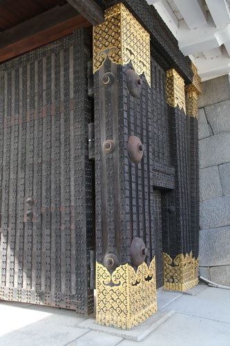 Zum Higashi Ote-mon: Das erste Haupttor der Burg im Osten war bereits ein Yagura-mon, also ein zweigeschossiges Tor, ganz ähnlich dem heutigen Tor. Als der Kaiser 1626 seinen offiziellen Besuch abstattete, wurde es zu einem einstöckigen Tor umgebaut, damit sich niemand höher als der Kaiser befinden konnte und gar auf ihn herabblicken konnte - eine Unmöglichkeit in der japanischen Etikette. Illustrationen aus der Zeit des Kaiserbesuchs zeigen deutlich, daß damals kein Obergeschoß existierte. Für diesen Besuch wurden auch die vergoldeten Zierbeschläge angebracht. 1662/1663 baute man es im Zuge anderer Umbauten im Burgschloß während der Kanbun-Ära wieder zu einem zweistöckigen Yagura-mon um, mit einer Verteidigungsetage über dem Durchgang, denn yagura = Wachturm (Funktion des Obergeschosses) und mon = Tor (Funktion des Erdgeschosses). Gemessen an der Lücke im Wall ist aus fortifikatorischen Gründen ein einstöckiges Tor unterdimensioniert, ganz zu schweigen von repräsentativen Erfordernissen für das Haupttor des Burgschlosses.
