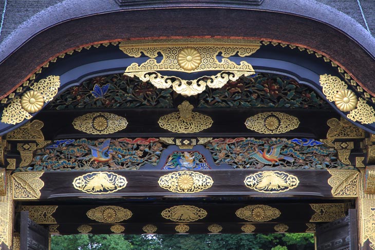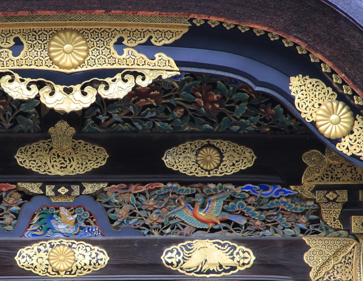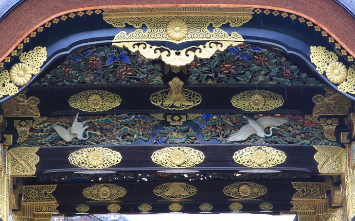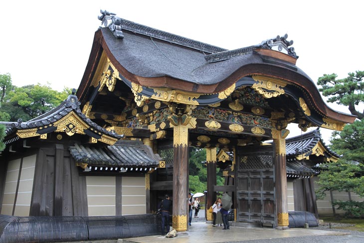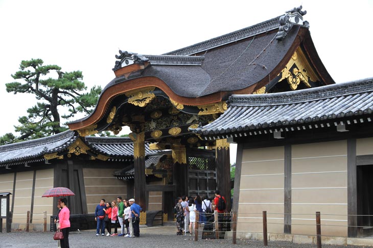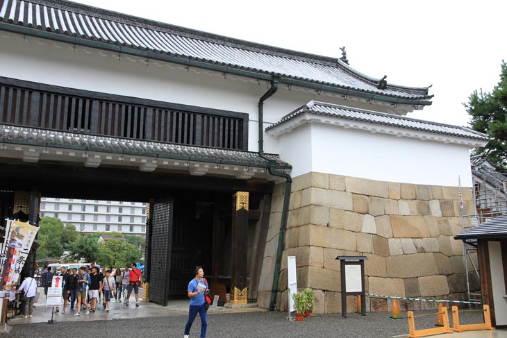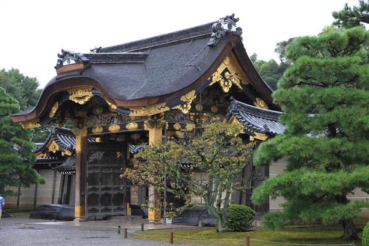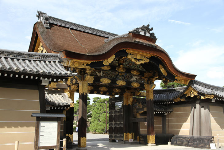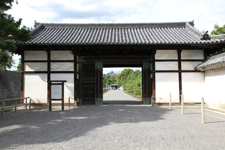Das Tor bildet den Haupteingang zum Ninomaru-Palast und wurde 1603 in einfacherer Form errichtet und 1625 im Jahr vor dem Kaiserbesuch umgestaltet. Vermutlich wurden Teile aus der Burg Fushimi hier verbaut, dafür spricht der der Azuchi-Momoyama-Zeit verhaftete opulente Stil. Sein Erscheinungsbild heute entspricht authentisch derjenigen des Jahres 1626. Es gehört zu den besten und aufwendigsten Kara-mon in Japan, im Gegensatz zu den noch besseren Exemplaren im Daitoku-ji, im Toyokuni-Schrein und im Nishi Hongan-ji, alle drei Nationalschätze, ist dieses Karamon in der Burg Nijo jedoch "nur" als wichtiges Kulturgut klassifiziert. Der Aufwand der Dekoration, der farbig gefaßten Schnitzereien (Kraniche und Schildkröten als Symbole für langes Leben, Bambus, Pflaumenblüten und Kiefern, Päonien und Schmetterlinge, insgesamt 10 chinesische Löwen = Shishi, Drachen und Tiger, Wolken, Menschen etc., auf der äußeren Seite die Kraniche, Schmetterlinge und Blüten, auf der Innenseite die Löwen, Tiger und Drachen), der vergoldeten Metallbeschläge an den Balkenköpfen etc. entspricht seiner Bedeutung als Hauptzugang zum Palast. Der ganze Bereich über den Hauptbalken ist mit Schnitzereien gefüllt, von denen die meisten Symbole für ein langes Leben, für Glück und für Regierungsgewalt sind. Die Vielzahl heiliger Tiere hebt einerseits den hinter dem Tor befindlichen Palast und andererseits den hindurchschreitenden Gast noch einmal in der Bedeutung empor. Das Tor wurde 1975 und danach zuletzt 2012-2013 unter der architektonischen Leitung von Goto Tamaki renoviert und ist ein glanzvoller Höhepunkt der japanischen Palastarchitektur. Dabei wurden alle dreidimensionalen Schnitzereien farblich neu gefaßt, alle Metallteile abgenommen und neu vergoldet und das Dach aus Zypressenrinde ausgebessert, unter Bewahrung der noch intakten Bedeckung, wo möglich. Bei der Restaurierung kam u. a. auch heraus, daß hinter einem kaiserlichen Chrysanthemen-Wappen das Tokugawa-Wappen verborgen war, eine im späten 19. Jh. vorgenommen Anpassung, als Nijo-jo kaiserliche Villa wurde.