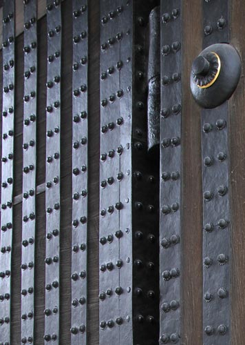 Die hölzernen Torflügel sind außen mit Eisenbändern verstärkt, Photo 2017