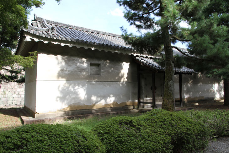 Im schmalen Westteil des Ninomaru stehen am Rand des inneren Wassergrabens symmetrisch zwei Edo-zeitliche Lagerhäuser, Sei-nan dozo (sei = Westen, nan = Süden, dozo = Lagerhaus) im Südwesten und Sei-hoku dozo (Sei = Westen, hoku = Norden, selbes Kanji wie kita) oder Yonezo (Reisspeicher) im Nordwesten, beide um 1626 erbaut und als wichtiges Kulturgut klassifiziert. Diese Lagerhäuser wurden aus Lehm erbaut, nicht aus Stein. Die Länge beträgt ca. 17 ken = 33 m. Das nördliche Lagerhaus ist innen in zwei Abschnitte unterteilt. Die Böden bestehen aus Holz. Eine Decke gibt es nicht, man blickt hoch in die Dachkonstruktion. Die Lagerhäuser sind die einzigen Gebäude auf dem Gelände von Nijo-jo mit ganz speziellen Fenstern, mit nach außen aufschlagenden Läden und einem Kupfernetz auf einer Eisenkonstruktion innen, um Fraßschädlinge auszusperren und trotzdem lüften zu können. Über den Fenstern sind kleine Vordächer gegen das Eindringen von Feuchtigkeit angebracht. Insgesamt gibt es noch drei solcher Lagerhäuser auf dem Burggelände, aber während der Edo-Zeit waren hier zehn solcher Speicher in Betrieb. Umgekehrt können wir froh sein über diese drei überlebenden Speicher, denn die machen Burg Nijo zur einzigen Burg, die überhaupt noch solche Speichergebäude aus Lehm besitzt. Normalerweise wurde in diesen Lagerhäusern Reis eingelagert, doch in den Burgen dienten einige dieser Gebäude auch als Waffenkammer, wie einige Gemälde aus der Kanei-Ära (1624-1644) illustrieren: Sie zeigen die Benutzung zum Lagern von Schießpulver und Feuerwaffen, aber kein erwiesenermaßen so genutztes Speichergebäude hat überlebt.