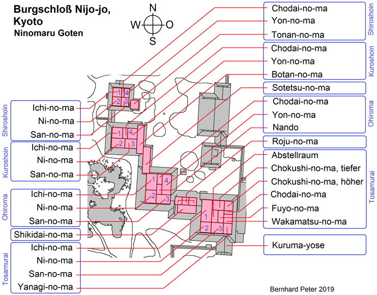 Der Stil der Gebäude wird Bukefu-shoin-zukuri genannt, ein Shoin-Stil speziell der städtischen Samurai-Residenzen (Buke = Schwertadel). Die charakteristischen Merkmale des Shoin-Stils, Chigaidana (gestaffelte Regale) und Tokonoma (Schmucknische) lassen sich in insgesamt vier Räumen finden, den jeweils höchstrangigen in jedem größeren Komplex. Ein weiteres Element ist ein Tsukeshoin, eine baulich fest integrierte, erhöhte Schreibnische. Eine solche läßt sich in drei Gebäuden finden, jeweils auf der Westseite der höchstrangigen Räume, mit Blick auf den Garten. Insgesamt weisen alle Räume des Palastes eine Grundfläche von 3300 m2 auf, verteilt auf 33 Räume, in denen ca. 800 Tatami-Matten liegen (genaugenommen 764 plus 66 im Botan-no-ma, dazu einige Räume ohne Matten, deren Fläche aber in solchen bemessen wird und die früher vermutlich auch mit Matten ausgestattet waren). Die Bezeichnung der Räume ist bis auf wenige Ausnahmen ein stereotypes Durchzählen, beginnend in der Nordwestecke, dann entgegen dem Uhrzeigersinn. Der wichtigste Raum, also der Raum Nr. 1 (Ichi-no-ma), liegt in drei der fünf Gebäude im Nordwesteck. Nur in einem einzigen liegt er im Nordosteck, das liegt aber daran, daß hier kaiserliche Gesandte empfangen wurden, und somit eine "Wichtigkeit von außen" hofiert wurde.