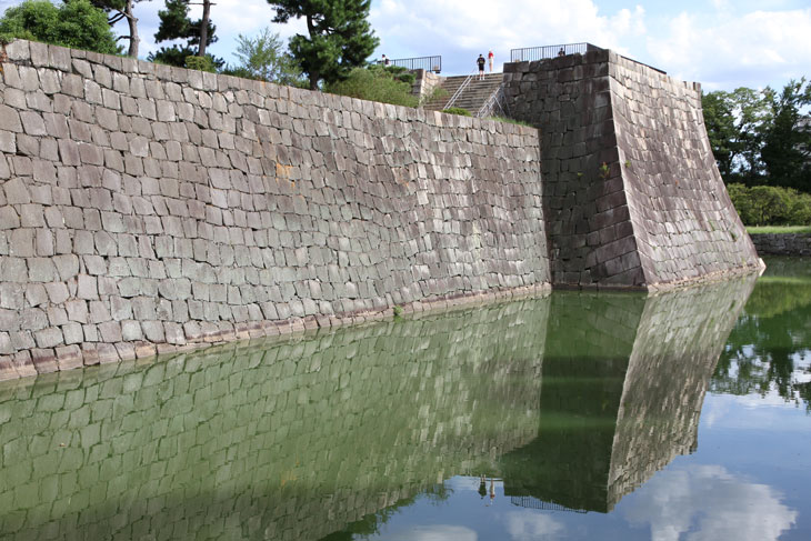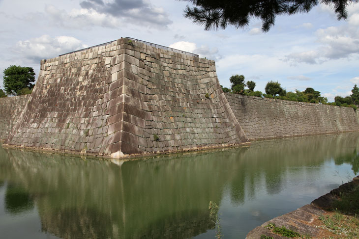 An den drei anderen Ecken befanden sich früher kleine Ecktürme, auch hier sind nur die Fundamente zu sehen, im Nordwesten der Sanju-yagura ato (Ruine eines dreistöckigen Wachturmes), ebenfalls ein bißchen eckig in den Wassergaben vorspringend, im Nordosten und im Südosten der Niju-yagura ato (Ruine eines zweistöckigen Wachturmes). Vermutlich wurden sie ebenso 1788 ein Opfer des Tenmei-Feuers wie der Honmaru Goten. Das Fundament des Tenshu ragt so weit über die Flucht der Wälle hinaus, daß der Wassergraben hier eckig nach außen springt, um eine sichere Breite zu behalten. Dieser Versatz wird vom Ninomaru aufgefangen und setzt sich nicht in den äußeren Wassergraben fort. Im Gegensatz zum äußeren Bereich sind die Wälle im Honmaru reihum auf der Innenseite gestuft. Die Steinstufen geben nicht nur eine höhere Stabilität, sondern sie machen den Verteidigern das Erklimmen der Wälle auf breiter Front einfacher.