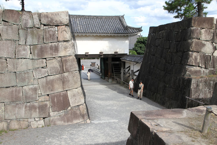 Während der äußere Bereich vier Tore nach außen besitzt, hat der "innere Kreis" (eigentlich maru = Kreis, auch wenn es hier ein Quadrat ist) nur zwei Tore. Der Honmaru besitzt im Osten und im Westen einen Brückenzugang; im Osten führt die Higashi-hashi (Ost-Brücke) zum leicht vorgezogen positionierten Honmaru Yagura-mon. Es wurde 1626 erbaut und ist als wichtiges Kulturgut klassifiziert. Es ist zum Schutz gegen Brandsätze und Feuerwaffen mit grün patinierten Kupferbeschlägen versehen und trägt ein Irimoya-Dach. Die früher zum Tor führende hölzerne Brücke konnte im Verteidigungsfall leicht niedergerissen werden. Früher war hier nicht eine einfache flache Brücke, sondern ein überbrückender gedeckter Korridor (Hashi roka, hashi = Brücke, roka = Korridor, Galerie). Deshalb kann man die Stelle auch Hashi roka ato nennen, Stelle bzw. Ruine (ato) der einstigen Korridorbrücke. Auf der Ninomaru-Seite war ein als Brückenkopf dienendes Gebäude, und von dessen Obergeschoß verlief ein gedeckter und seitlich geschlossener Korridor (s. o.) über der seitlich offenen Brücke darunter zum Obergeschoß des Yagura-mon. Im Ernstfall riß man die Konstruktion einfach ein. Zugbrücken wie in Europa waren nicht üblich, man riß die Brücke einfach ab. In den Erdwällen rechts und links des Weges hinter dem vorgezogenen Tor sind seitlich quadratische Schießscharten für Gewehre zu sehen. Dahinter erst durchschreitet man die Lücke zwischen den steinverkleideten Wällen, wobei der Weg noch einen rechts-links-Versatz macht. Diese Stelle wird Nishi kokou genannt, westlicher Tigerrachen (Tiger = tora, selbes Zeichen wie ko, Rachen = Mund = kuchi, selben Zeichen wie kou), sehr bildlich, den genau so muß sich ein Eindringling fühlen, wenn rechts und links die Verteidiger auf den Wällen stehen. Da sich früher auf dem Honmaru-Bereich Reisspeicher befanden und auch ein Brunnen vorhanden war, konnte man im inneren Bereich Belagerungen aussitzen.