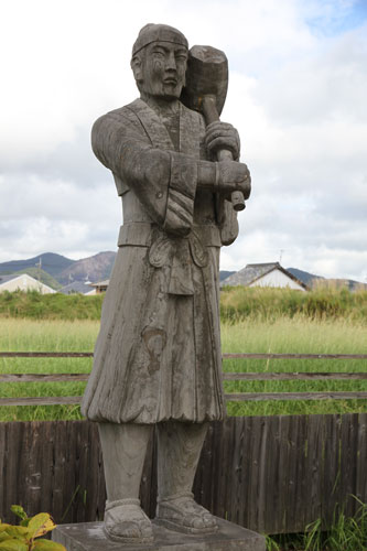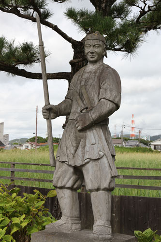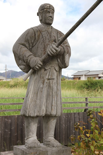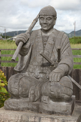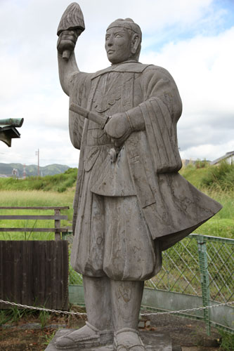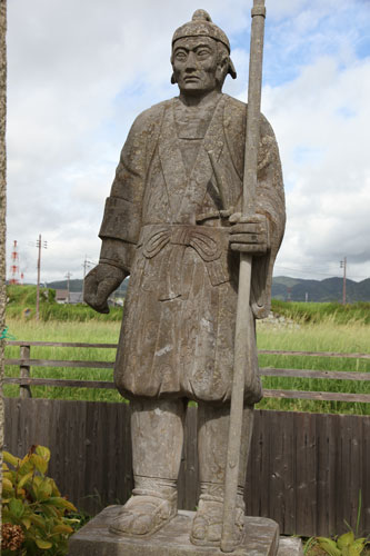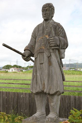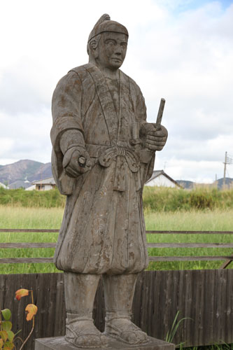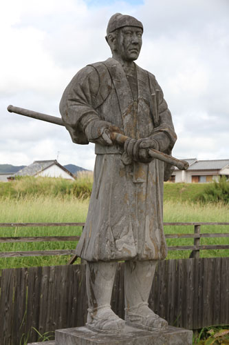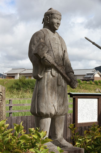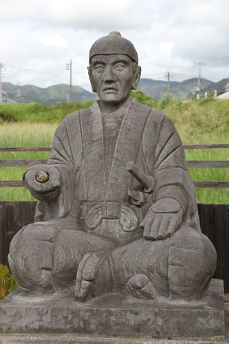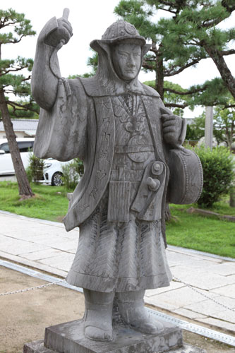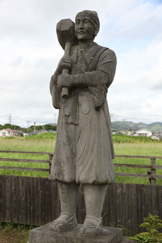 rechts: der kleine Samurai hält eine Daruma-Figur im linken Arm.