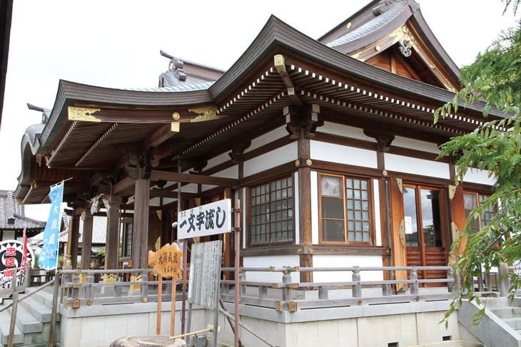 linke Tafel, links in schwarzer Schrift: Oishi-Schrein, rechts in roter Schrift: Gebet um Seelenfrieden.