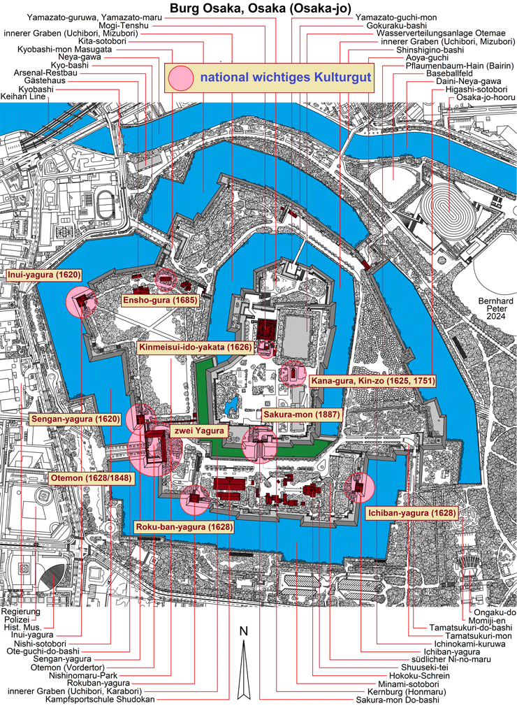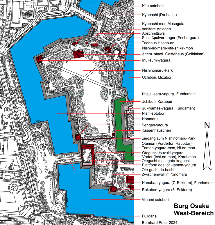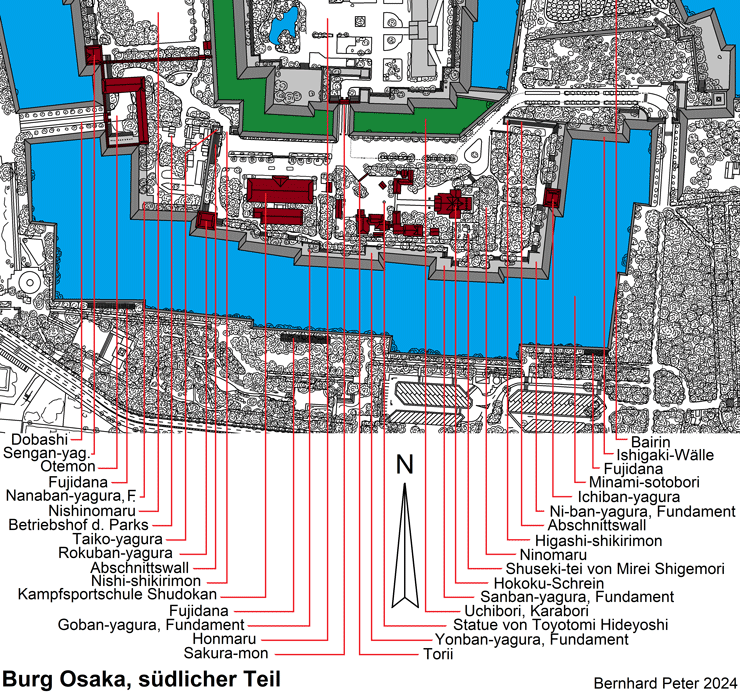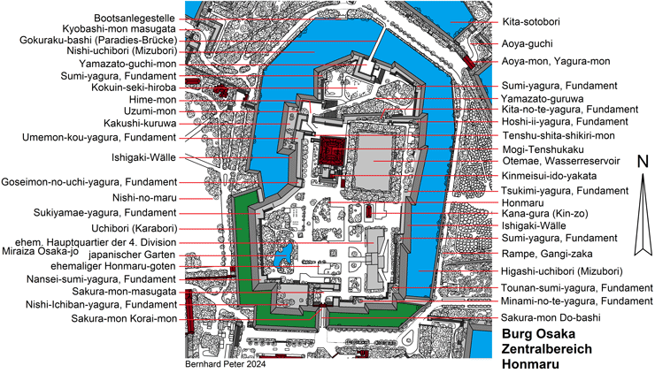 https://www.osakacastlepark.jp/articles/detail.html?id=180&lang=en - Honmaru: https://www.osakacastlepark.jp/articles/detail.html?id=177&lang=en - Ninomaru: https://www.osakacastlepark.jp/articles/detail.html?id=178&lang=en - östlicher Sotobori: https://www.osakacastlepark.jp/articles/detail.html?id=179&lang=en - Nishinomaru-Garten: https://www.osakacastlepark.jp/articles/detail.html?id=72&lang=en - Hoshoan: https://www.osakacastlepark.jp/articles/detail.html?id=33&lang=en - Tamon Yagura des Otemon: https://www.osakacastlepark.jp/articles/detail.html?id=54&lang=en - Sengan-yagura: https://www.osakacastlepark.jp/articles/detail.html?id=55&lang=en - Inui yagura: https://www.osakacastlepark.jp/articles/detail.html?id=181&lang=en - Ichiban yagura: https://www.osakacastlepark.jp/articles/detail.html?id=183&lang=en - Rokuban-yagura: https://www.osakacastlepark.jp/articles/detail.html?id=184&lang=en - Ensho-gura: https://www.osakacastlepark.jp/articles/detail.html?id=57&lang=en - Kana-gura bzw. Kinzo: https://www.osakacastlepark.jp/articles/detail.html?id=52&lang=en - wichtige Kulturgüter: https://www.osakacastlepark.jp/articles/detail.html?id=49&lang=en - Otemon: https://www.osakacastlepark.jp/articles/detail.html?id=185&lang=en - Sakura-mon: https://www.osakacastlepark.jp/articles/detail.html?id=50&lang=en - überdachter Brunnen: https://www.osakacastlepark.jp/articles/detail.html?id=51&lang=en - zentrale Fläche des Honmaru: https://www.osakacastlepark.jp/articles/detail.html?id=205&lang=en - https://www.osakacastlepark.jp/articles/detail.html?id=206&lang=en - https://www.osakacastlepark.jp/articles/detail.html?id=207&lang=en - Schäden am Tenshudai: https://www.osakacastlepark.jp/articles/detail.html?id=209&lang=en - Hoshi-ii-yagura: https://www.osakacastlepark.jp/articles/detail.html?id=214&lang=en - Tsukimi-yagura: https://www.osakacastlepark.jp/articles/detail.html?id=210&lang=en - Militärmuseum und Seppuku-Stelle: https://www.osakacastlepark.jp/articles/detail.html?id=211&lang=en - Kita shikiri-mon: https://www.osakacastlepark.jp/articles/detail.html?id=215&lang=en - Obangashira-Residenz: https://www.osakacastlepark.jp/articles/detail.html?id=212&lang=en - Hokoku-Schrein: https://www.osakacastlepark.jp/articles/detail.html?id=213&lang=en - Sukiyamae-yagura: https://www.osakacastlepark.jp/articles/detail.html?id=216&lang=en
