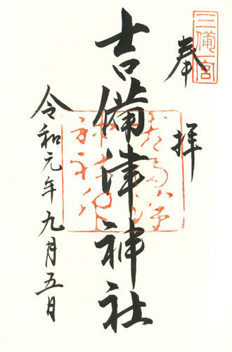 Abb. rechts: Kibitsu (Präfektur Okayama), Schrein Kibitsu-jinja, linke Spalte: Datum: 5.9.2019 = Reiwa 1 nen ku-gatsu itsuka. Das Goshuin des Kibitsu-Schreins trägt in der oberen rechten Ecke einen rechteckigen roten Siegelstempel, der aus vier Kanji besteht. Wer die Zahlzeichen ein bißchen beherrscht, erkennt an erster Stelle die drei Striche übereinander für san = 3 und an dritter Stelle den einzelnen Horizontalstrich für ichi = 1. Insgesamt heißt das San-bi Ichi-no-miya. Die San-bi, also die drei "Bi" sind Bizen, Bitchuu und Bingo in der Region San-youdou. Einst gehörten alle drei zusammen und bildeten das historische Königreich Kibi (Kibi no kuni) im westlichen Japan. Später wurde es eine Provinz des Yamato-Reiches. Im 7. Jh. wurde die Provinz dann in drei Teile geteilt: Vorder-Kibi entspricht Bizen, Mittel-Kibi entspricht Bitchuu, und Hinter-Kibi entspricht Bingo. Alle drei zusammen werden auch Bishuu genannt, Bi-Provinzen. Und für diese ist der Kibitsu-Schrein, in dessen Name auch das ehemalige Königreich Kibi steckt, der Ichi-no-miya = der erstrangige Schrein, der jeweils oberste Schreine der früheren Provinzen. Genauer der Kibitsu jinja in Okayama für die Provinz Bitchuu, der Kibitsu jinja in Fukuyama für die Provinz Bingo und der Kibitsuhiko-jinja in Okayama für die Provinz Bizen. Was der Kami-jinja in Kyoto für die Provinz Yamashiro, der Hiraoka jinja in Higashi-osaka für die Provinz Kawachi und der Sumiyoshi-taisha in Osaka für die Provinz Settsu war, war der Kibitsu jinja mit seinen Ablegern für die drei Provinz mit "Bi-".