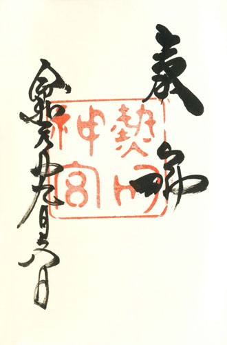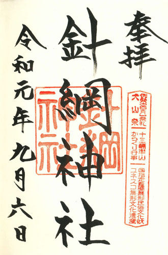 Abb. links: Inuyama (Präfektur Aichi), Schrein Haritsuna jinja, linke Spalte: Datum: 6.9.2019 = Reiwa 1 nen ku-gatsu muika, Abb. rechts: Nagoya, Schrein Atsuta jingu, linke Spalte: Datum: 6.9.2019 = Reiwa 1 nen ku-gatsu muika.