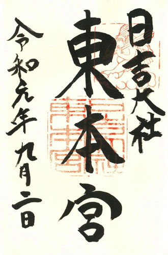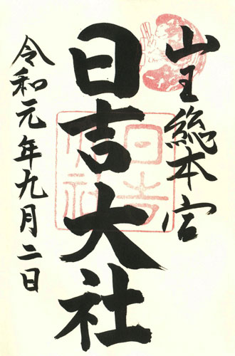 Abb. links: Otsu (Präfektur Shiga), Schrein Hiyoshi Taisha, rechter Teil, linke Spalte: Datum: 2.9.2019 = Reiwa 1 nen ku-gatsu futsuka, mittlere Spalte: Higashi hongu, rechte Spalte: Hiyoshi Taisha. Rechts oben ein figürlicher oberer roter Stempel mit Affe. Abb. rechts: Otsu (Präfektur Shiga), Schrein Hiyoshi Taisha, linker Teil, linke Spalte: Datum: 2.9.2019 = Reiwa 1 nen ku-gatsu futsuka, Mitte senkrecht: Hiyoshi Taisha, rechts: Sannou ... hongu. Man achte auf den Affen im oberen roten Stempel.