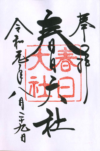 Abb. links: Kyoto, Kodaiji-Tenmangu (Tsunashiki-Tenjin-Schrein), rechte Spalte unten: Datum: 27.8.2019 = Reiwa 1 nen hachi-gatsu ni-juu-shichi-nichi, Abb. rechts: Nara, Schrein Kasuga-Taisha, linke Spalte: Datum: 29.8.2019 = Reiwa 1 nen hachi-gatsu ni-juu-ku-nichi.