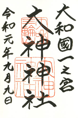 Abb. links: Kyoto, Heian-Schrein, linke Spalte: Datum: 8.9.2019 = Reiwa 1 nen ku-gatsu youka, Abb. rechts: Sakurai (Präfektur Nara), Schrein Omiwa jinja, linke Spalte: Datum: 9.9.2019 = Reiwa 1 nen ku-gatsu kokonoka.