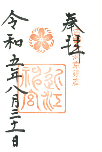 Abb. links: Kyoto, Schrein Kamigamo jinja, rechte Spalte: Ichinomiya in der Provinz Yamashiro, mittlere Spalte: Kamo Wakeikazuchi-jinja, linke Spalte: Datum: 4.9.2019 = Reiwa 1 nen ku-gatsu yokka.