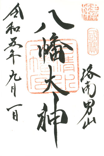 Abb.: links: Kyoto, Yawata, Schrein Iwashimizu Hachiman-gu, Mittelspalte: Hachiman O-kami, ganze linke Spalte: Datum: Fr, 1.9.2023 = Reiwa 5 nen ku-gatsu tsuitachi. Rechte spalte unten: Otokoyama. Abb. rechts: Kamakura, Präfektur Kanagawa, Schrein Tsurugaoka-Hachiman-gu, Mittelspalte: Tsurugaoka Hachiman-guu, linke Spalte: Datum: Mo, 4.9.2023 = Reiwa 5 nen ku-gatsu yokka.