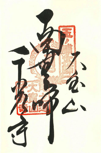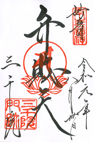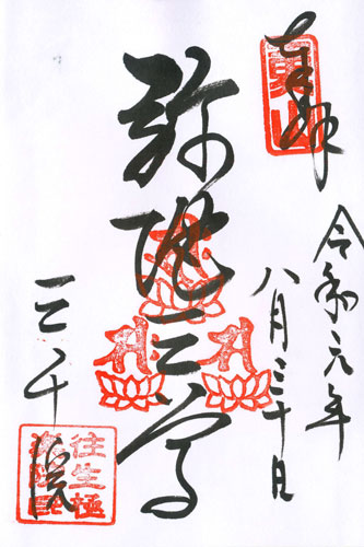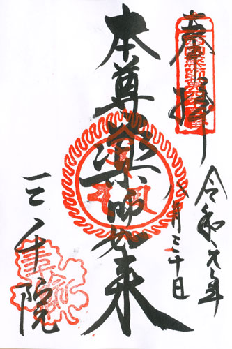 Abb. links: Ohara (Kyoto), Sanzen-in, Ennyo-do des Haupttempels, für die Amida-Triade, linke Spalte: "Sanzen-in", mittlere Spalte: "(A)mida Sanzon", rechte Spalte unten: Datum: 30.8.2019 = Reiwa 1 nen hachi-gatsu san-juu-nichi. Abb. rechts: Otsu (Präfektur Shiga), Berg Hiei, Teil Mudo-ji, Gebäude Mudo-ji, rechte Spalte unten: Datum: 2.9.2019 = Reiwa 1 nen ku-gatsu futsuka.