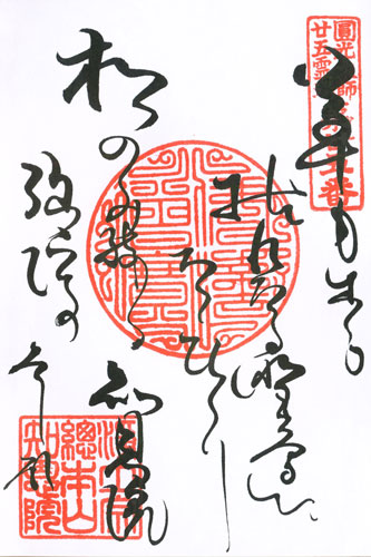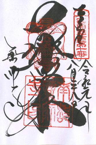 Abb. links: Kyoto, Chion-in, Stempel für die Halle Seishido. In der Halle Seishi-do wird der Bodhisattva Mahasthamaprapta (jap. Dai Seishi) verehrt. Dieser Bodhisattva steht für die Kraft der Weisheit. Der Mönch Honen hatte als Kindheitsnamen den Namen Seishi-maru. Rechte Spalte unten: Datum: 27.8.2019 = Reiwa 1 nen hachi-gatsu ni-juu-shichi-nichi. Abb. rechts: Kyoto, Kongo-ji (Yasaka Koshindo), Datum: 27.8.2019 = Reiwa 1 nen hachi-gatsu ni-juu-shichi-nichi.