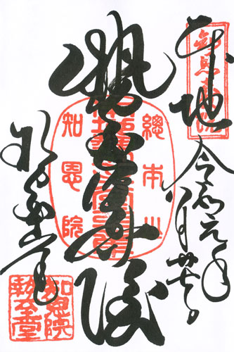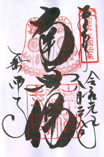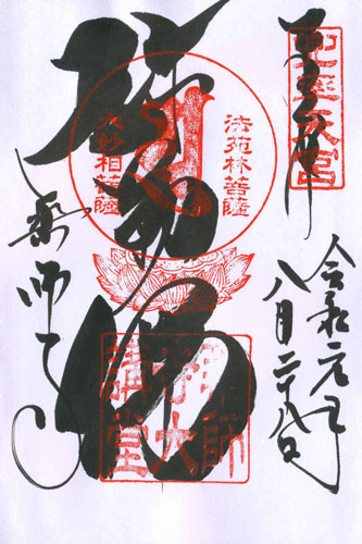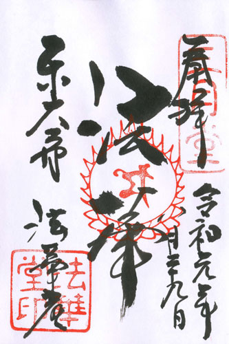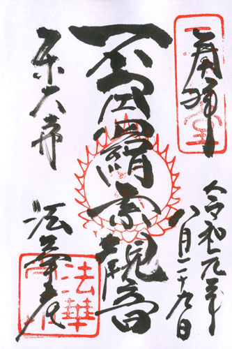 Abb. links: Nara, Hokkedo (Todai-ji-Komplex), rechte Spalte unten: Datum: 29.8.2019 = Reiwa 1 nen hachi-gatsu ni-juu-kui-nichi, roter Stempel rechts oben: "Sangatsudo", großes Sumigaki in der Mitte: "Hokke" = Lotus, auch im roten Stempel links unten tauchen die beiden Zeichen für "Hokke" auf. Abb. rechts: Nara, Hokkedo (Todai-ji-Komplex), rechte Spalte unten: Datum: 29.8.2019 = Reiwa 1 nen hachi-gatsu ni-juu-ku-nichi, roter Stempel rechts oben: "Sangatsudo", großes Sumigaki in der Mitte: "Fuku-kensaku-Kannon", denn diese Form der Kannon ist das Hauptkultbild in der Halle und ein Nationalschatz dazu; im roten Stempel links unten tauchen wieder die beiden Zeichen für "Hokke" auf.