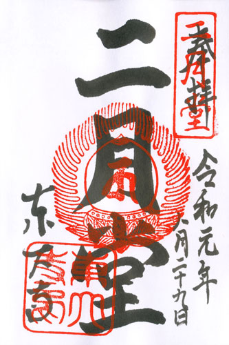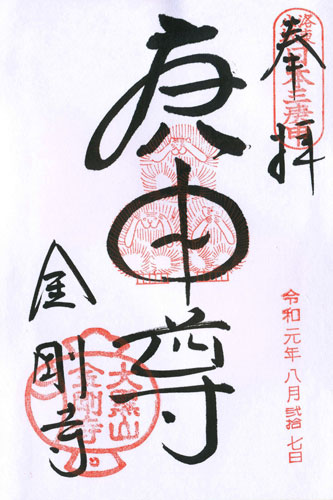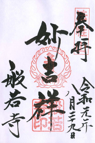 Abb. links: Nara, Hannya-ji, rechte Spalte unten: Datum: 29.8.2019 = Reiwa 1 nen hachi-gatsu ni-juu-ku-nichi. Abb. rechts: Nara, Nigatsudo (Todai-ji-Komplex), mittlere Spalte "Nigatsudo", rechte Spalte unten: Datum: 29.8.2019 = Reiwa 1 nen hachi-gatsu ni-juu-ku-nichi, roter Stempel oben rechts: "Nigatsudo".