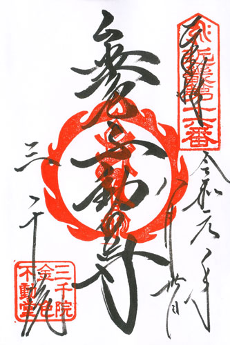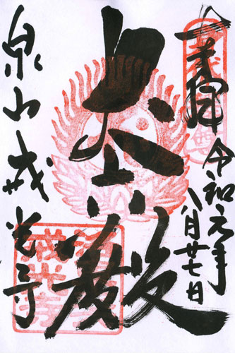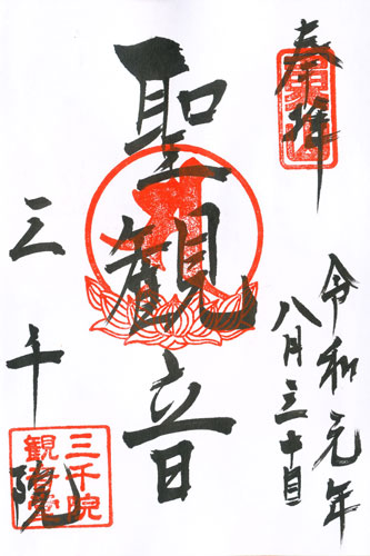 Abb. links: Ohara (Kyoto), Sanzen-in, Fudo-do, linke Spalte: "Sanzen-in", rechte Spalte unten: Datum: 30.8.2019 = Reiwa 1 nen hachi-gatsu sam-juu-nichi. Abb. rechts: Ohara (Kyoto), Sanzen-in, Fudo-do, linke Spalte: "Sanzen-in", rechte Spalte unten: Datum: 30.8.2019 = Reiwa 1 nen hachi-gatsu san-juu-nichi.